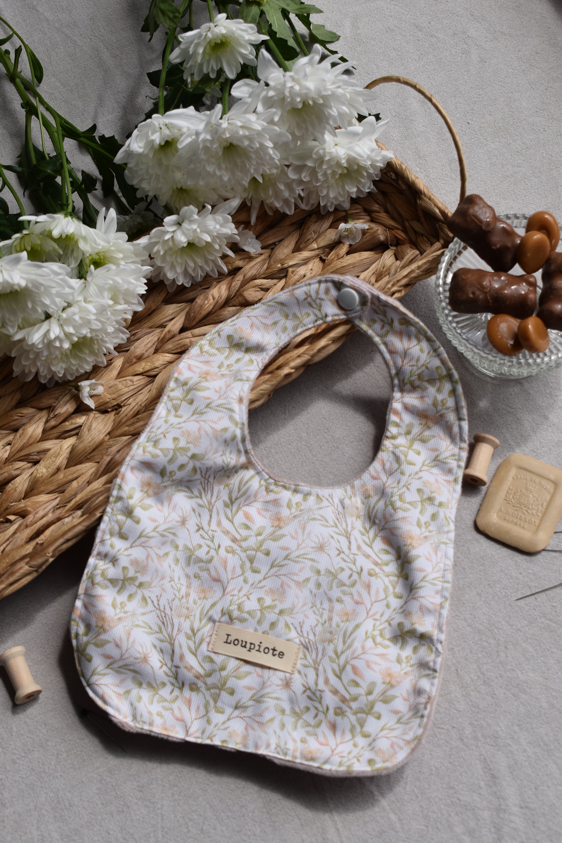 Ce bavoir est confectionné avec un tissu tout doux, délicatement assorti à un tissu fleuri. Pensé avec soin pour les tout premiers jours de votre bébé, il a été conçu pour l’accompagner longtemps, grandir avec lui et rester un essentiel du quotidien en alliant confort, praticité et esthétisme.